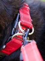 バックルと2つのリングで二重に固定するので、万が一バックルが壊れても外れません。白の縫い糸は反射機能付きなので、暗くなってからのお散歩も安心です。